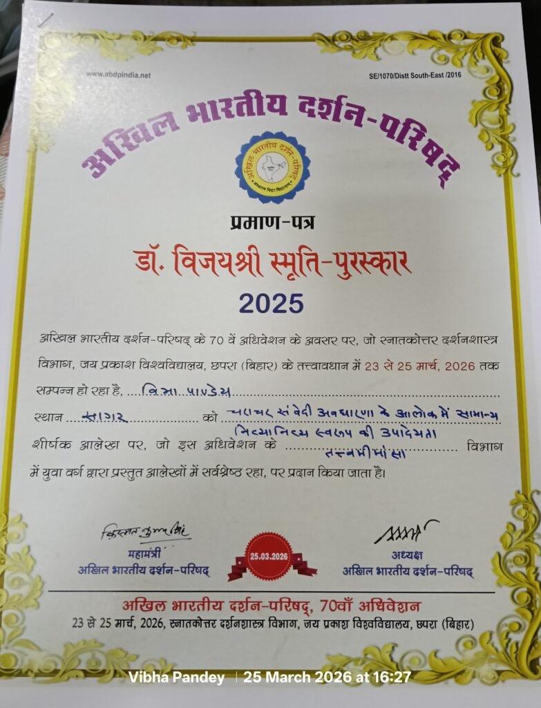 विभा पाण्डेय जो मूलरूप से प्रयागराज उत्तर प्रदेश के मूल निवासी हैं को डॉ. विजयश्री स्मृति-पुरस्कार महात्मा गांधी केंद्रीय विश्वविद्यालय, मोतिहारी के कुलपति प्रो. संजय श्रीवास्तव के हाथों प्रदान किया गया। इस अवसर पर जय प्रकाश विश्वविद्यालय के कुलपति परमेंद्र कुमार बाजपेई, मुख्य अतिथि के रूप में प्रो. संजय श्रीवास्तव (कुलपति, महात्मा गांधी केंद्रीय विश्वविद्यालय, मोतिहारी), वहीं विशिष्ट अतिथि के रूप में प्रो. शशि प्रताप शाही (कुलपति, मगध विश्वविद्यालय, बोधगया) एवं प्रो. लक्ष्मी निवास पाण्डेय (कुलपति, कामेश्वर सिंह दरभंगा संस्कृत विश्वविद्यालय) एवम् आखिल भारतीय दर्शन परिषद् के अध्यक्ष प्रो.अम्बिका दत्त शर्मा (सेवानिवृत्त दर्शन डॉ. हरीसिंह गौर विश्वविद्यालय सागर मध्य प्रदेश) मौजूद रहे। बताते चले कि विभा पाण्डेय डॉ. हरीसिंह गौर विश्वविद्यालय सागर मध्य प्रदेश के दर्शनशास्त्र विभाग की शोधार्थी है। यह उपलब्धि दर्शनशास्त्र विभाग के लिए गौरवान्वित करने वाली बात है। यह उपलब्धि अन्य विद्यार्थियों और शोधार्थियों के प्रेरणास्त्रोत है।