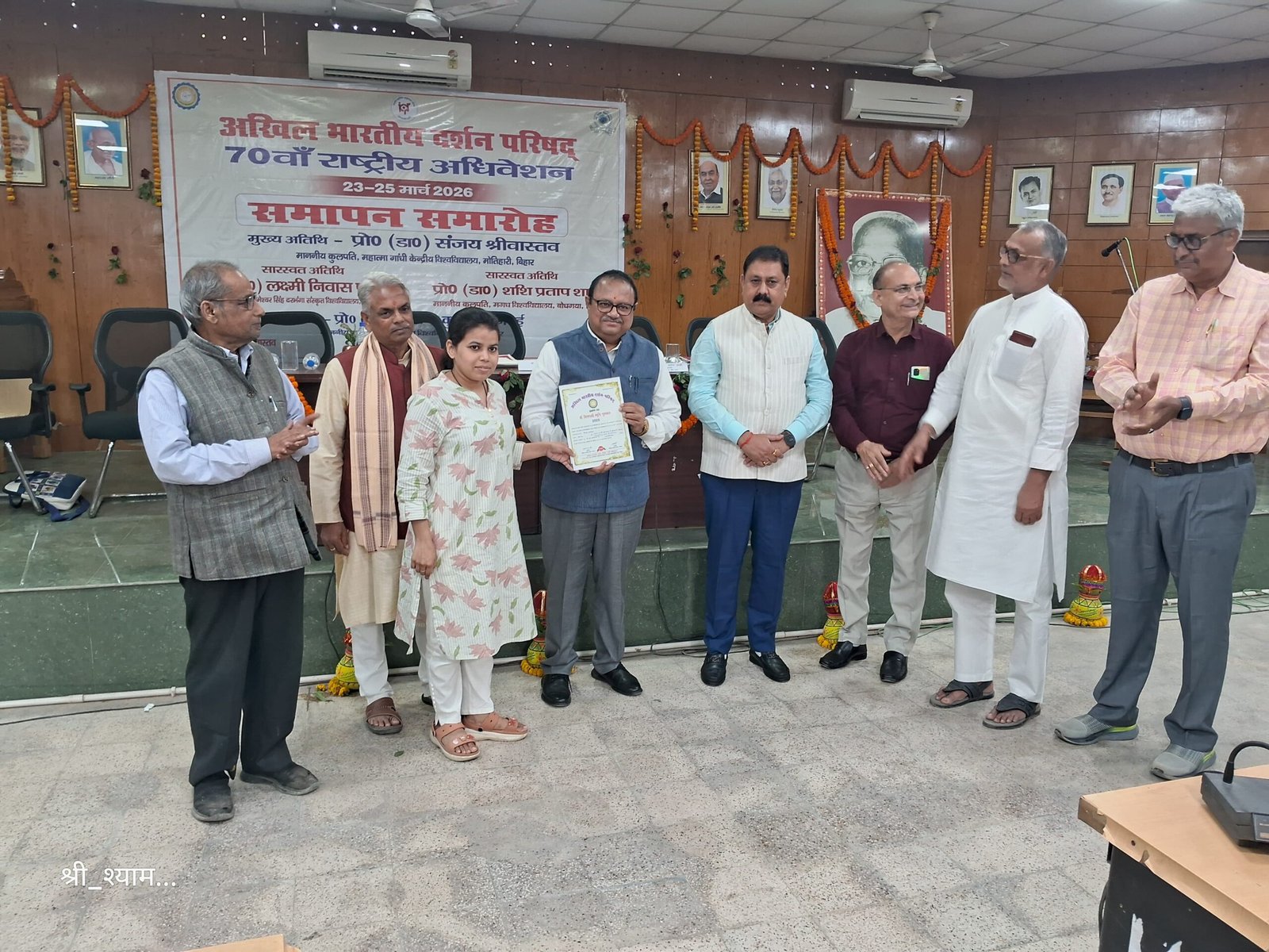 सागर। अखिल भारतीय दर्शन परिषद् के 70वे अधिवेशन जो कि जय प्रकाश विश्वविद्यालय छपरा, बिहार के तत्वधान में 23 से 25 मार्च को सम्पन्न हुआ। इस अधिवेशन के समानांतर सत्र के तत्वमीमांसा विभाग में विभा पाण्डेय द्वारा “चराचर संवेदी अवधारणा के आलोक मे सामान्य नित्यानित्य स्वरूप की उपादेयता” विषय पर शोध आलेख प्रस्तुत किया गया। जिसमें विभिन्न विभाग में प्रस्तुत आलेखों में से विभा पाण्डेय का आलेख युवा आलेखों में सर्वश्रेष्ठ चुना गया फलस्वरूप इन्हें डॉ. विजयश्री स्मृति पुरस्कार दिया गया।