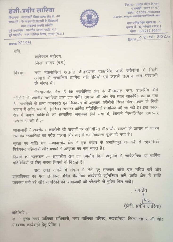 सागर। नरयावाली विधायक इंजी.प्रदीप लारिया ने नगर पालिका परिषद मकरोनिया के अंतर्गत दीनदयाल नगर हाउसिंग बोर्ड कॉलोनी में एक निजी आवास में संचालित हो रही अनाधिकृत धार्मिक गतिविधियों और उससे उत्पन्न जन-परेशानी पर कड़ा रुख अपनाया है। स्थानीय नागरिकों की शिकायतों को संज्ञान में लेते हुए, विधायक ने कलेक्टर सागर और मुख्य नगरपालिका अधिकारी (CMO) मकरोनिया को पत्र लिखकर तत्काल हस्तक्षेप और वैधानिक कार्यवाही की मांग की है।