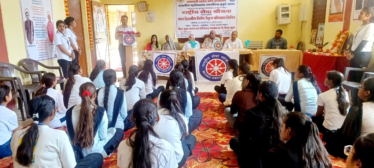 सागर ।प्रधानमंत्री कॉलेज ऑफ़ एक्सीलेंस शासकीय महाविद्यालय मकरोनिया बुजुर्ग की राष्ट्रीय सेवा योजना (एनएसएस) छात्रा इकाई द्वारा ग्राम पंचायत साईंखेड़ा में सात दिवसीय पूर्णकालिक आवासीय विशेष शिविर का शुभारंभ किया गया। यह शिविर 23 फरवरी से 01 मार्च तक आयोजित किया जा रहा है। शिविर का शुभारंभ माँ सरस्वती के चित्र पर दीप प्रज्ज्वलन एवं माल्यार्पण के साथ हुआ। इस अवसर पर स्वयंसेविकाओं द्वारा सरस्वती वंदना एवं लक्ष्य गीत प्रस्तुत किया गया। तत्पश्चात मुख्य अतिथि, विशिष्ट अतिथि एवं अन्य अतिथियों का तिलक, पुष्पगुच्छ एवं एनएसएस बैज लगाकर स्वागत किया गया।