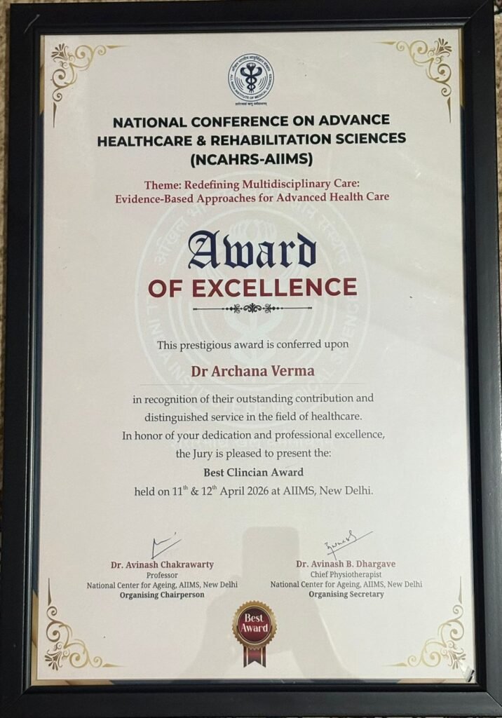 सागर. स्वास्थ्य सेवा एवं पुनर्वास विज्ञान के क्षेत्र में बुंदेलखंड मेडिकल कॉलेज (BMC), सागर ने राष्ट्रीय पटल पर अपनी छाप छोड़ी है। बीएमसी में पदस्थ फिजियोथेरेपिस्ट डॉ. अर्चना वर्मा को AIIMS, नई दिल्ली में आयोजित नेशनल कॉन्फ्रेंस (NCAHRS-AIIMS) में प्रतिष्ठित “बेस्ट क्लिनिशियन अवॉर्ड” से नवाजा गया है। उनके उत्कृष्ट क्लिनिकल कार्य और मरीजों के वैज्ञानिक पुनर्वास (Scientific Rehabilitation) के लिए उन्हें सम्मानित किया गया।