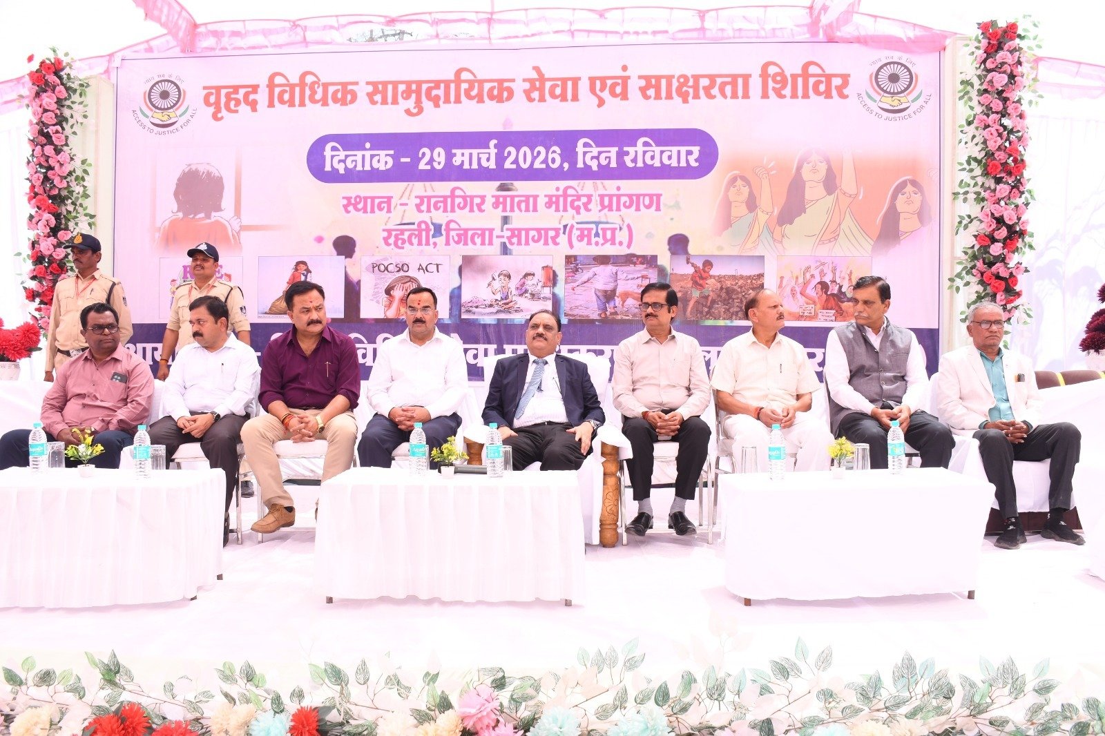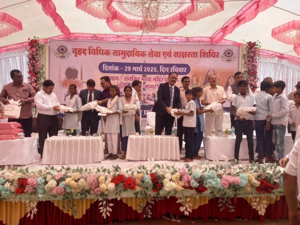 सागर। म.प्र. राज्य विधिक सेवा प्राधिकरण, जबलपुर के निर्देशानुसार जिला विधिक सेवा प्राधिकरण सागर के तत्वाधान में ग्राम रानगिर के माँ हरसिद्धी मंदिर प्रांगण में मेगा विधिक साक्षरता शिविर का आयोजन मा. प्रधान जिला न्यायाधीश एम.के.शर्मा की अध्यक्षता में किया गया। शहर से लगभग 45 कि.मी. दूर ग्राम रानगिर का चयन रानगिर व आस-पास के समस्त ग्रामों के निवासियों को विधिक सेवा एवं शासन के विभिन्न विभागों की विभिन्न योजनाओं का लाभ पहुँचाने, योजनाओं की जानकारी देने, अनेक विधियों की जानकारी देने, जनसामान्य के विधिक अधिकारों की जानकारी देने व उनकी समस्याओं का डोर स्टेप निराकरण करने के उद्देश्य से किया गया। जिसमें शिविर स्थल पर ही 3320 लोगों को शासन की विभिन्न योजनाओं से लाभान्वित किया गया।